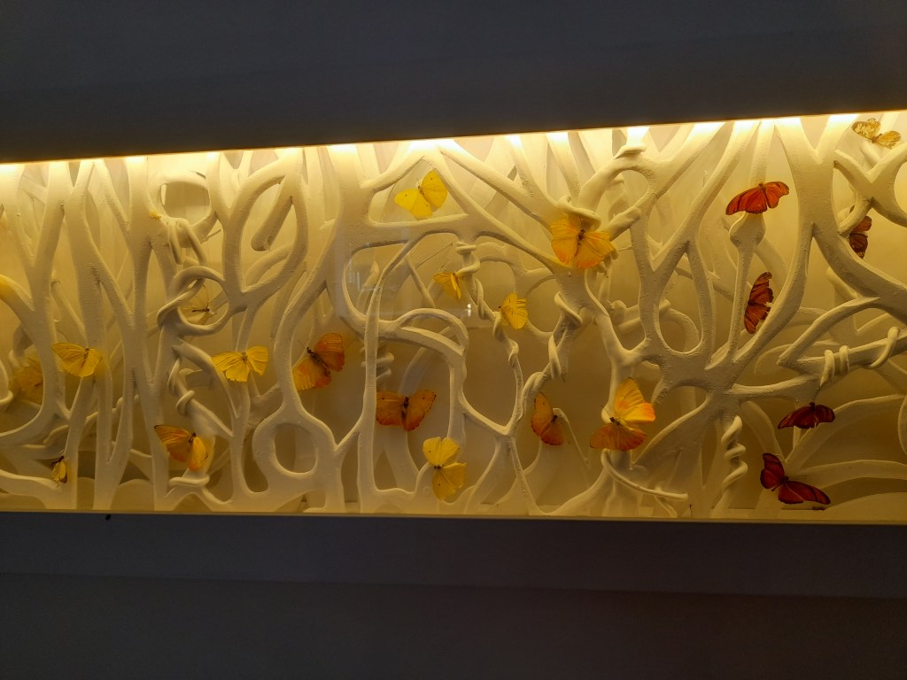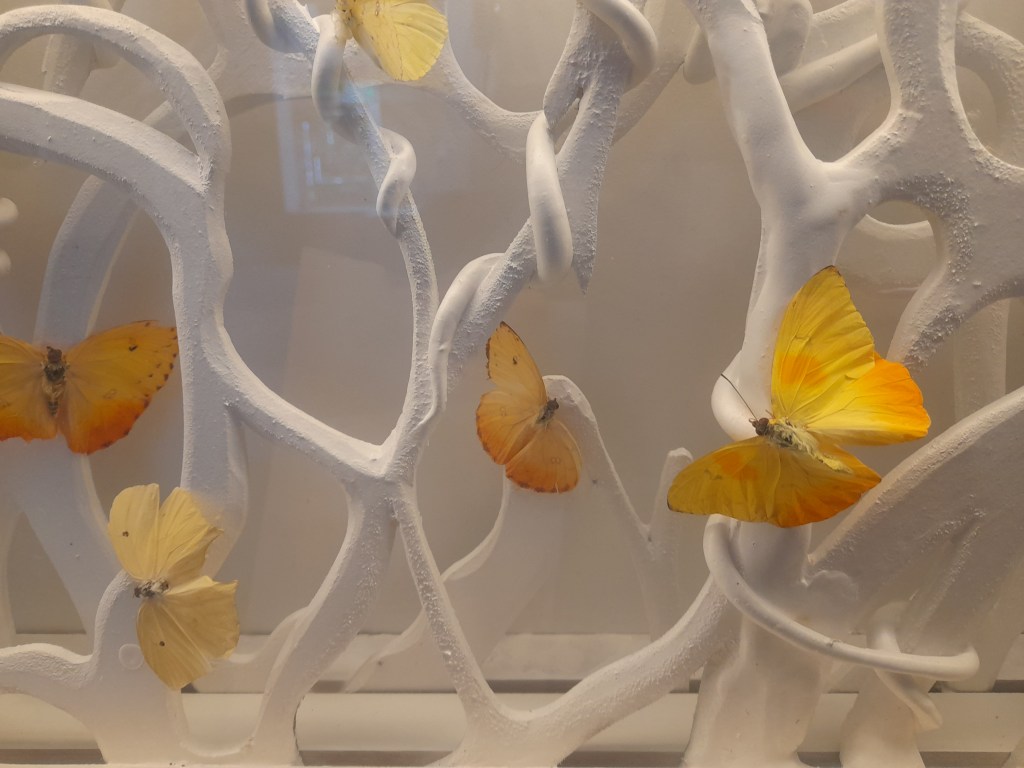 Pero la muestra sobresale por lo que denomina Mutatis Mutandis, donde recurre a las mariposas para recrear ese proceso de metamorfosis, donde se transforma de oruga en una belleza sin igual. Para mostrar su hábitad, combina cuadros de papel calado generando un cosmos selváticos óptimos para las especies inventadas con partes de varios insectos.