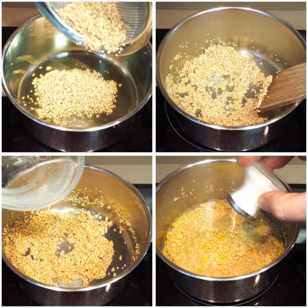 - Poner a hervir la quinua en abundante agua. Cuando comienza el hervor, se decanta el excedente de agua, dejando los granos apenas cubiertos si se los quiere graneados, o con unos cinco centímetros de agua excedente si se desea un grano pastoso.
