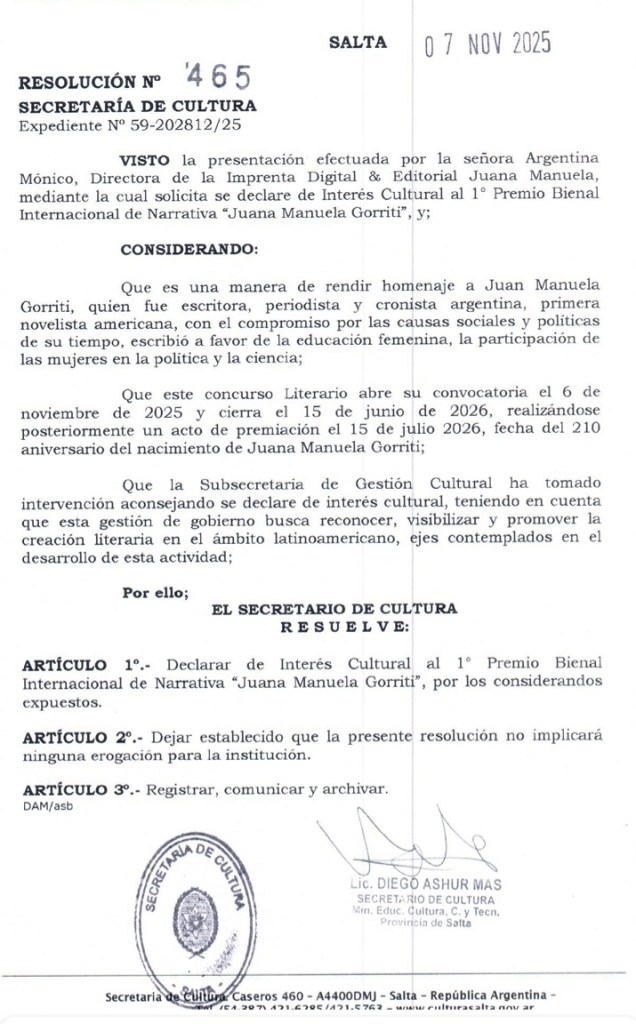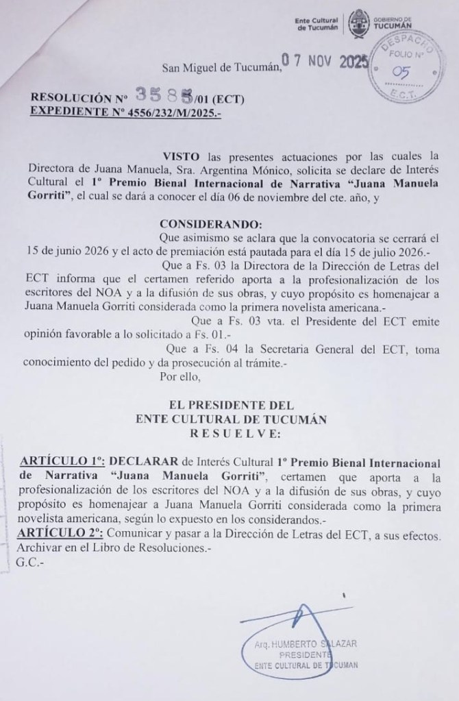 La Editorial Juana Manuela avanza en su compromiso con la difusión de la cultura latinoamericana mediante la creación del Premio Bienal Internacional de Narrativa “Juana Manuela Gorriti”, una propuesta que rinde homenaje a la figura de una mujer excepcional: escritora, periodista, educadora y visionaria.