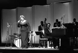 Antes se casa con Ray Brown y en el contrabajo se acuna un changuito adoptado. Qué alta está la luna la ubica en la cima. Todos quieren grabar con Ella. Peterson, Ellington, Basie, Louis Armstrong.