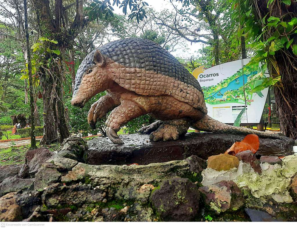 Al trasponer la entrada, vemos una escultura del ocarro; un hermoso armadillo que habita en la selva amazónica. Un animal excepcional que vive en el territorio andino, conocido también como gurre. Vive en el interior de la tierra en cuevas que el mismo socava. El nombre de ocarro se debe a la presencia de un armadillo gigante, oriundo del Vichada; el cual pudimos ver en una de las jaulas en estado de sueño dentro de ese territorio diverso.