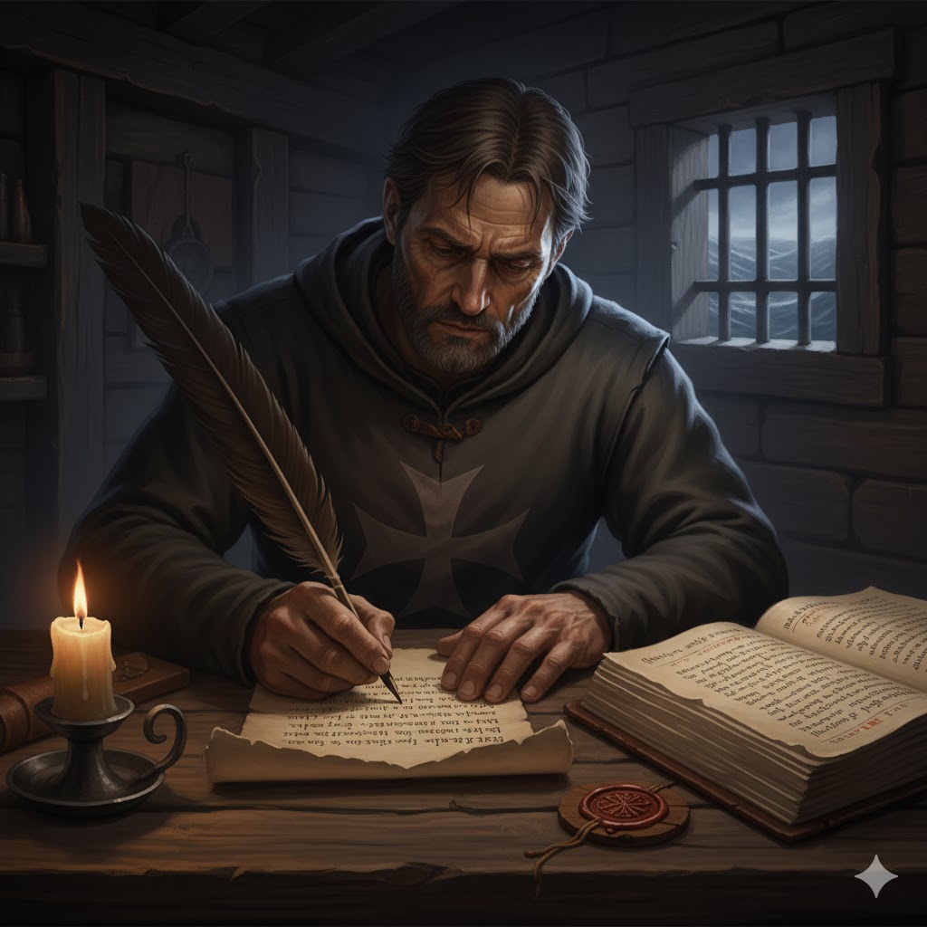 Guillaume de Lyon se sienta y comienza a escribir. Cristina me cuenta que el mar, para él, es un «refugio en tránsito». El Capitán no solo surca tempestades; navega su propia reconstrucción a través de dos textos: su Bitácora (la memoria colectiva de los Templarios) y «Mi Confesión», su libro secreto.