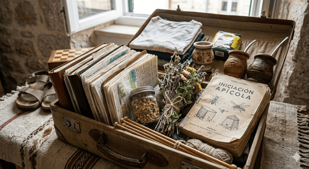 Las cosas sobre las que escribo en 2026: Una valija de 22 kilos de cuadernos completos. Las agujas de tejer que fueron de mi mamá y de mi abuela. El tablero de ajedrez de Incas contra colonos. Un manual de iniciación apícola de los años 60.