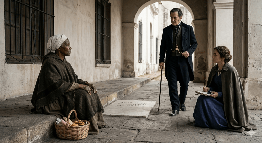 De pronto, un caballero de levita cruza el atrio. Al sacar su pañuelo, un destello dorado escapa de su bolsillo: un reloj de cadena que brilla bajo el sol pálido. María Remedios se tensa. Su espalda, marcada por los azotes, se pone recta como si volviera a vestir el uniforme.