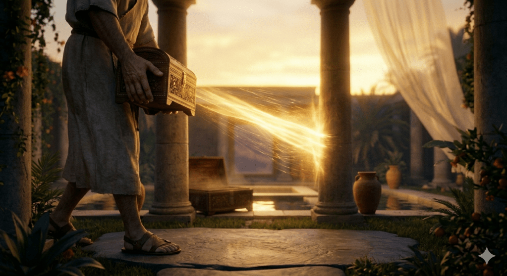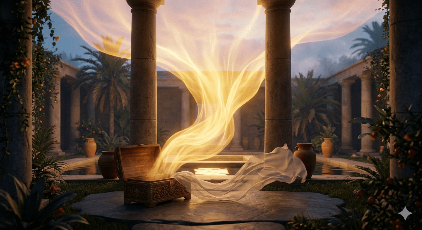EL CURADOR camina con un pequeño cofre de madera sándalo. Se detiene ante una ráfaga de luz dorada que vibra entre dos columnas de piedra.