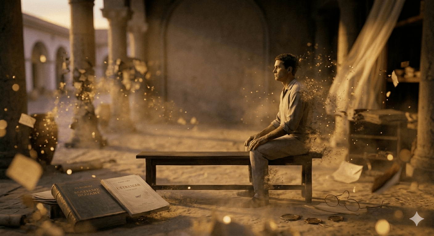 En Meursault impera el sentimiento de lo absurdo, la acción gratuita, el crimen sin sentido (“pensé en ese momento que se podía tirar o no tirar y que daba lo mismo”), la banalidad de su lenguaje como cuando frente al tribunal que lo está juzgando, y que lo condenará a muerte por haber asesinado a un árabe en la playa, ante la pregunta “por qué mató al árabe”, responde: “por el sol”. No se defiende y todo es igual. Cuando lo encierran en la cárcel, ya condenado a morir en la guillotina, todo el problema para él consiste en “matar el tiempo”. Entonces rememora los objetos que le rodean en la celda y enumera sus mínimos detalles, acto que nos evoca a “Funes el Memorioso” del cuento de Borges, un personaje que a causa de un golpe en la cabeza pierde la capacidad de seleccionar y jerarquizar los hechos. Dice Meursault.